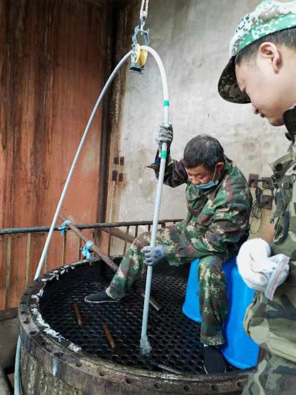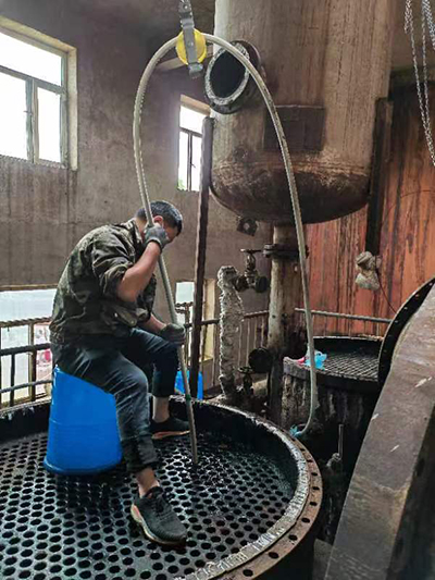 2022年5月28日黑龍江省哈爾濱市呼蘭區(qū)康金鎮(zhèn)小趙村哈爾濱市盛大化工有限公司在費總的精心安排下,孫總親自坐鎮(zhèn)指導(dǎo),生產(chǎn)廠長潘峰與河南都市機械設(shè)備有限公司喬主任,都紅植技師密切配合,徹底了解GQ-600型智能清洗機的性能和特點,使用600型智能清洗機四個要點1,不能缺水,要使用干凈的靜水,2,過載保護扭力限制器要調(diào)到,軟軸跳動可以自動停下來,不然既不安全,又失去他的意義,3,軟軸要放平拉直,順勁擺放,不能打死彎,盡可能防止扭軸斷軸,4,鉆頭要大小適當,太大了容易卡軸扭軸斷軸,并且一定要直對疏通管道口。三天時間打通清洗了兩臺徹底堵死好、結(jié)垢堅硬的污水蒸發(fā)器,廢水蒸發(fā)器,沒有損壞一根軟軸,沒有損壞一個鉆頭和配件,為糠醛行業(yè)增加了自信,減少了資金損耗,降低成本,提益,做出了標桿!